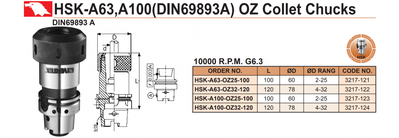 – Các bầu kẹp dao chuôi HSK-A63, HSK-A100 của VERTEX bao gồm: bầu kẹp collet ER; bầu kẹp collet OZ; bầu kẹp mũi khoan chuôi côn; bầu kẹp dao phay khỏa mặt; và bầu kẹp vít kẹp. Thông số cụ thể từng model theo trang catalogue phía trên.
