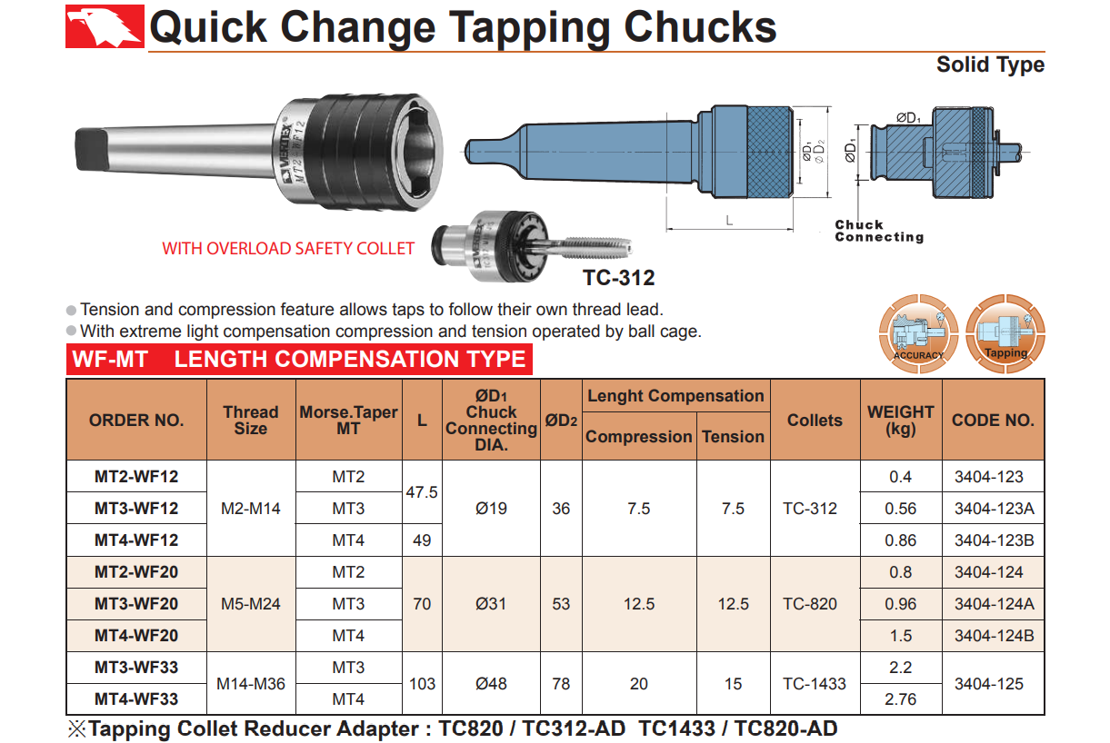 – Bầu kẹp ta rô kiểu collet thay nhanh VERTEX sử dụng kẹp ta rô từ M2 – M36 và 1/8” – 1-3/8”.