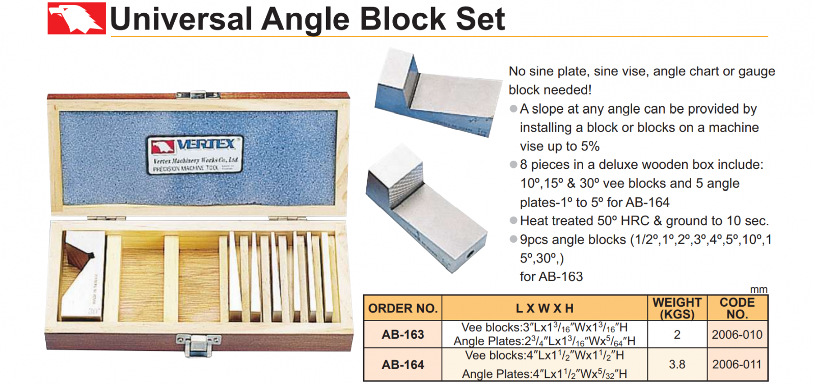 – Bộ căn góc chính xác AB-130, AB-163, AB-164, AB-166, AB-167, AB-113 của VERTEX được sử dụng để kê định vị tạo góc nghiêng cho chi tiết khi phay, khoan, mài,…