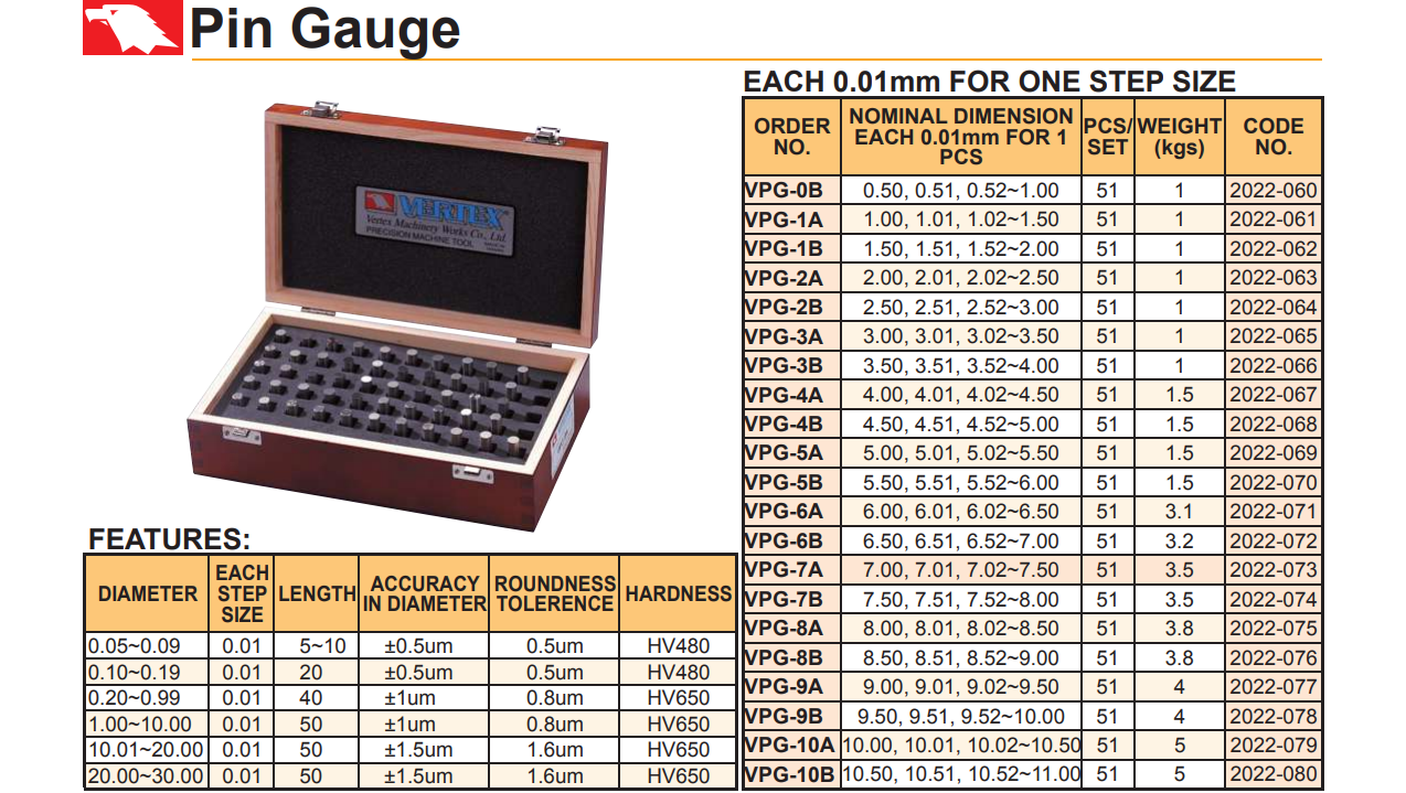 – Bộ căn mẫu tròn: VPG-0B, VPG-1A, VPG-1B, VPG-2A, VPG-2B, VPG-3A, VPG-3B, VPG-4A, VPG-4B, VPG-5A, VPG-5B, VPG-6A, VPG-6B, VPG-7A, VPG-7B, VPG-8A, VPG-8B, VPG-9A, VPG-9B, VPG-10A, VPG-10B