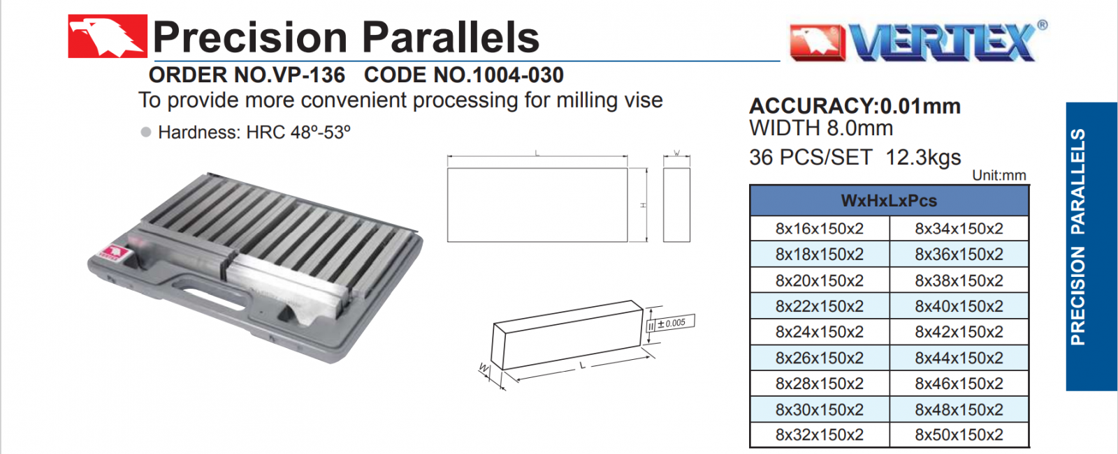 + BỘ CĂN SONG SONG VP-136 chuyên dùng cho công việc gá đặt trên bàn máy phay , máy khoan máy mài ( được sử dụng để đệm, căn chỉnh phôi, khi gá kẹp phôi trên ê tô máy phay)