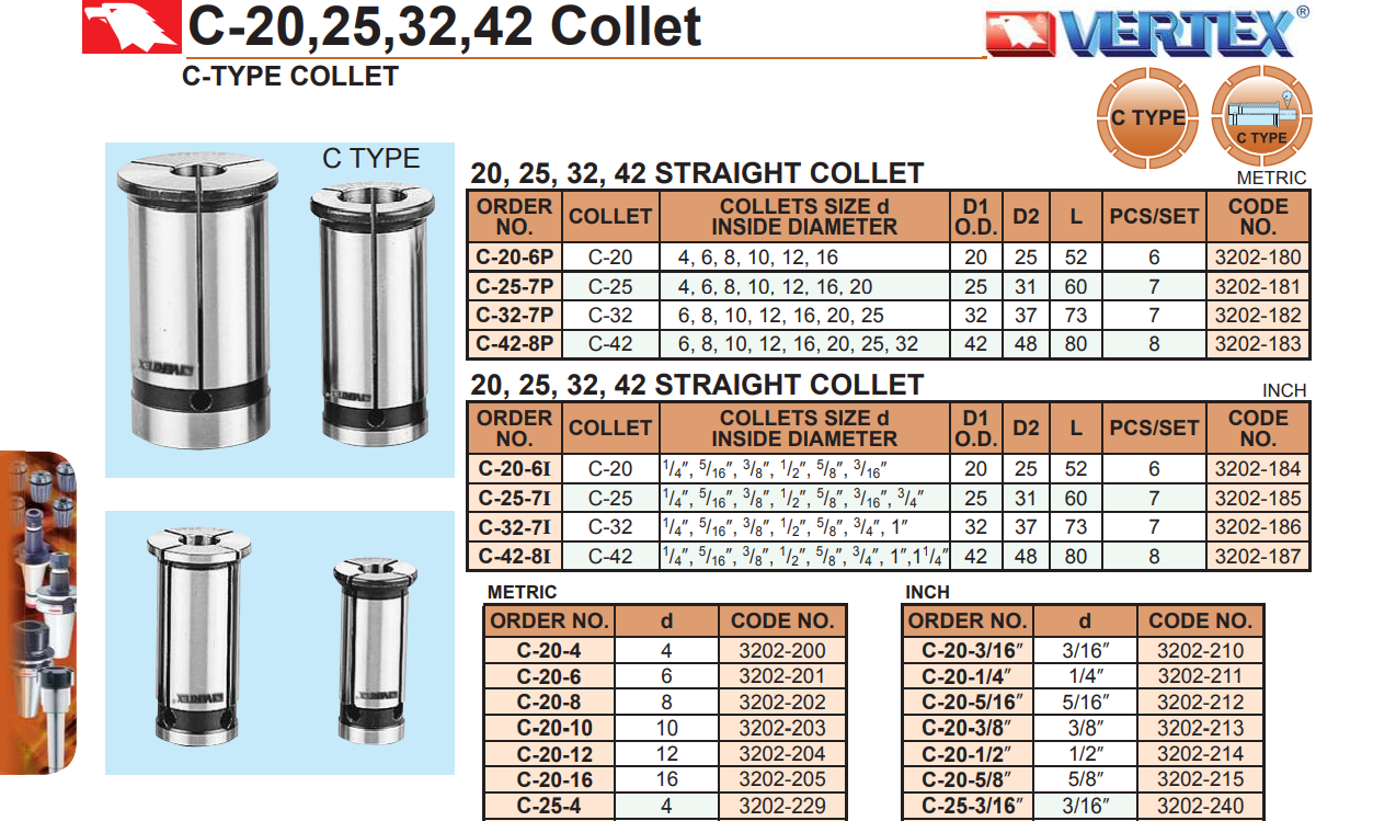 Bảng bộ collet trụ C-32, C-42, C-20, C-25 (bao gồm cả bộ, đơn lẻ, hệ Mét, Inch): C-20-6P, C-25-7P, C-32-7P, C-42-8P, C-20-6I, C-25-7I, C-32-7I, C-42-8I; C-20-4~C-20-16; C-25-4~C-25-20; C-32-6~C-32-25; C-42-6~C-42-32;…
