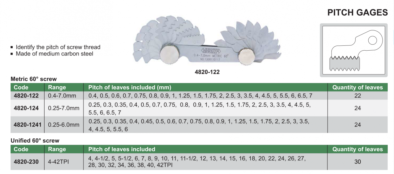 Bộ dưỡng đo ren INSIZE 4820-122 , PITCH GAGES 4820-122