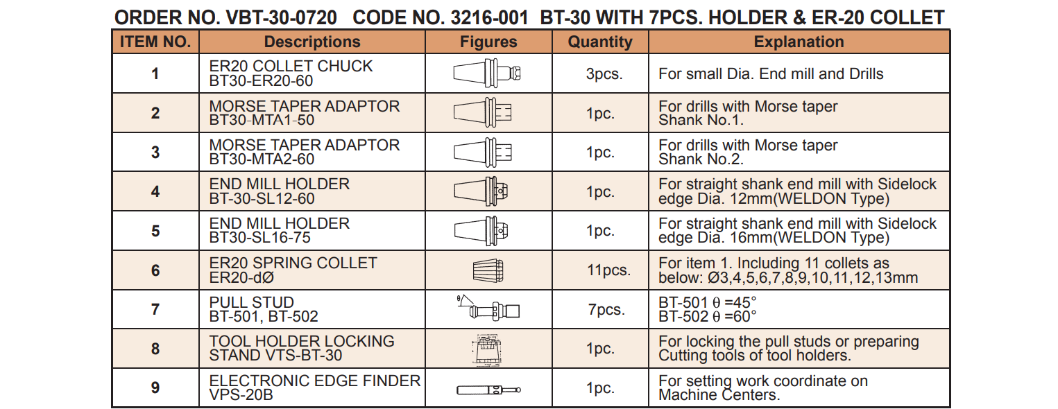 – Bộ gá kẹp dao đầy đủ cho máy phay NC VBT-30-0720, VBT-30-1520, VBT-40-1532, VBT-40-2432 của VERTEX dùng gá kẹp dao trên máy phay NC kiểu côn BT30, BT40.