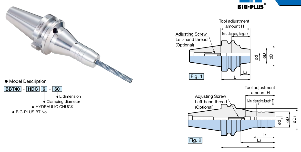 | BBT SHANK Model | Fig. | φd | φD | ΦD1 | L1 | L2 | H | E | Adjusting Screw(Optional) |