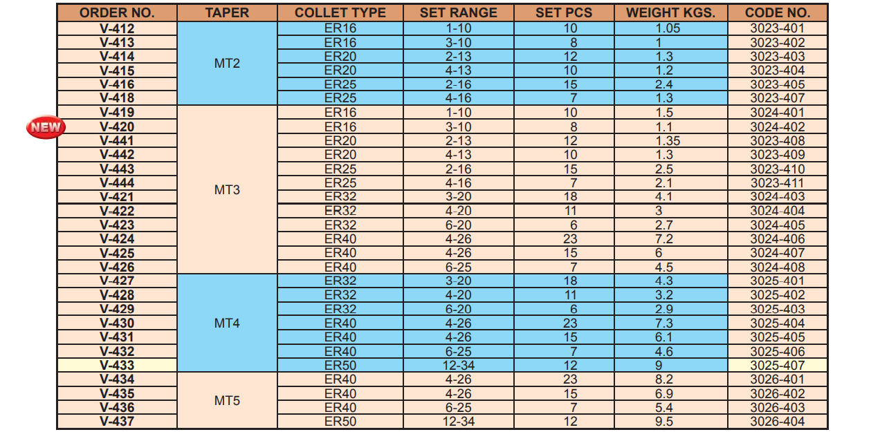 Bầu kẹp kiểu MT collet ER mã V-401, V-402, V-403, V-404, V-405, V-406, V-451, V-452, V-407, V-408, V-409, V-410, V-411, V-412, V-413, V-414, V-415, V-416, V-418, V-419, V-420, V-441, V-442, V-443, V-444, V-421, V-422, V-423, V-424, V-425, V-426, V-427, V-428, V-429, V-430, V-431, V-432, V-433, V-424, V-435, V-436, V-437 đầy đủ các kiểu size cho bạn lựa chọn. Sản phẩm được phân phối và giao tận nơi trên toàn quốc