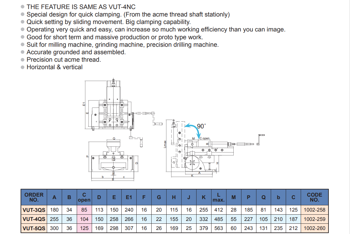 – Ê tô kẹp nhanh bàn nghiêng VUT có thể thiết lập được góc nghiêng từ 0 – 90°.