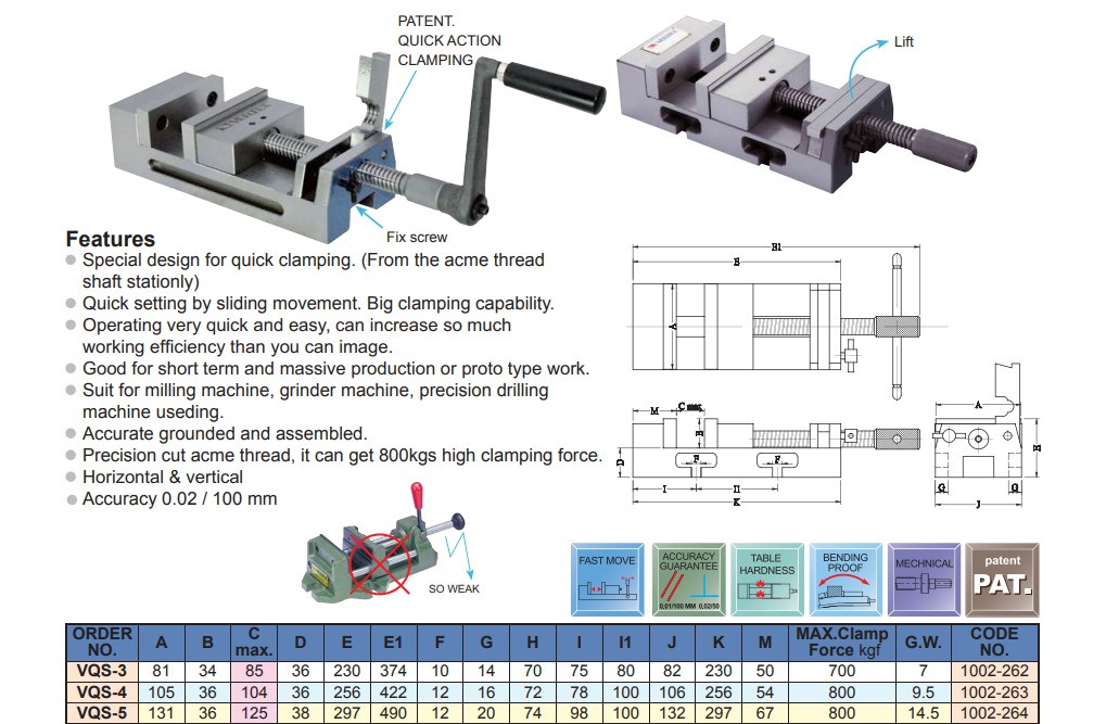 – Ê tô kẹp nhanh có thiết kế thêm mỏ kẹp vít me đặt biệt. Mỏ kẹp có thể tháo ra và nhấc lên nhanh chóng cho trục vít me di chuyển tự do dọc trục để thay đổi độ mở tùy thích ngay lập tức.