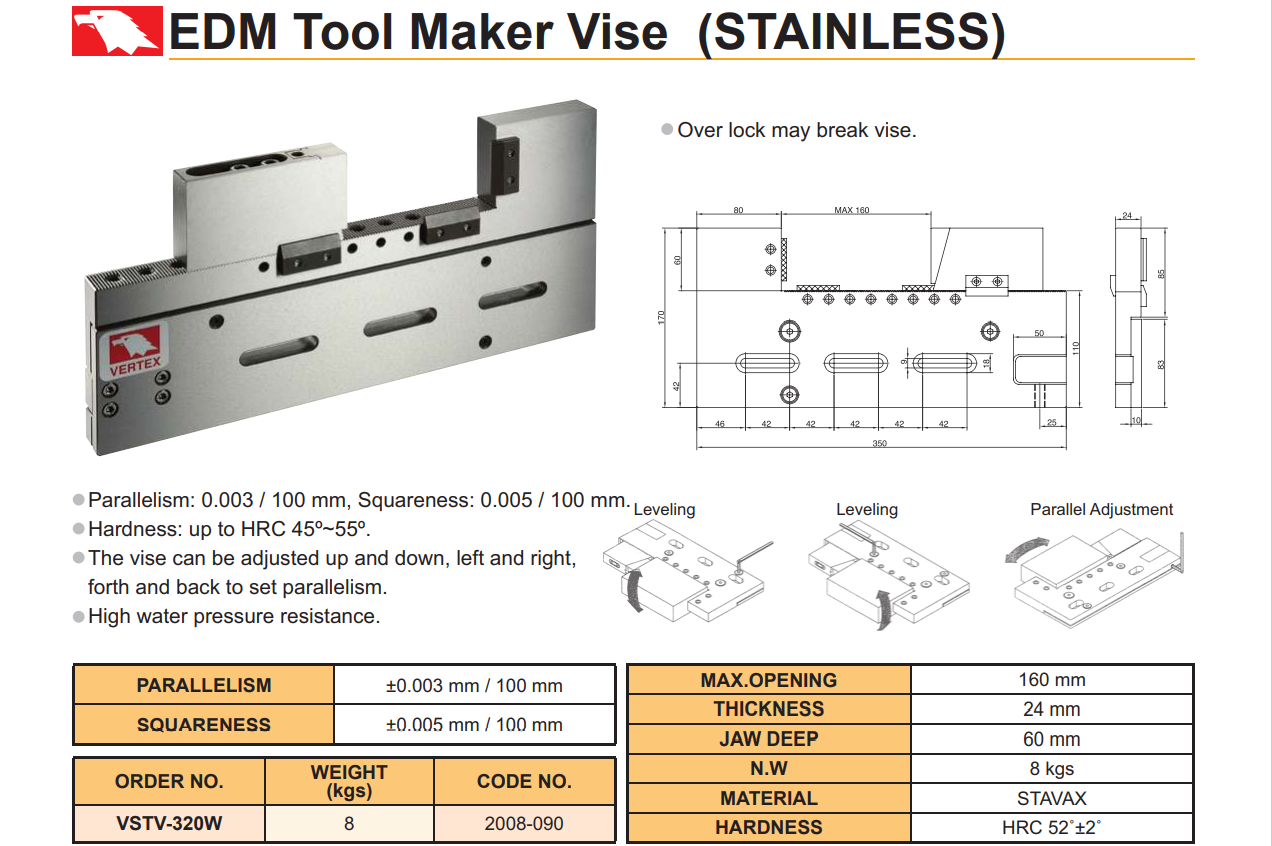 Ê tô máy EDM Vertex VSTV-320W với vật liệu là thép không gỉ, dùng để gá kẹp các chi tiết trong quá trình xung, cắt dây….
