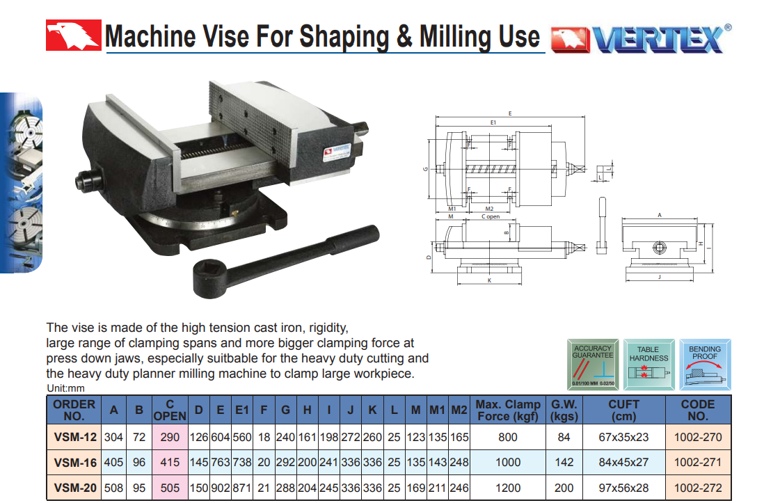 – Ê tô máy phay VSM của VERTEX có khoảng kẹp rất rộng (290mm-505mm), lực kẹp lớn (800Kg-1200Kg) và chắc chắn.