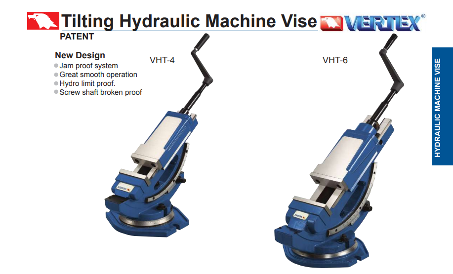 • Ê tô thủy lực nghiêng mã VHT-4, VHT-6 hãng Vertex sản xuất với chất lượng cao, sản phẩm này được sử dụng rộng rãi trong việc gia công cơ khí đòi hỏi độ chia độ nghiêng chính xác với thao tác điều chỉnh dễ dàng.