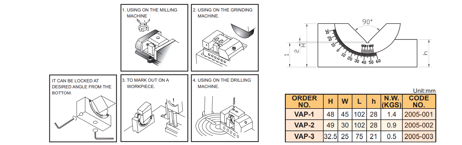 – Khối V điều chỉnh góc nghiêng VAP-1, VAP-2, VAP-3, VAPM-1, VAPM-2, VAPM-3 của VERTEX được sử dụng để định vị tạo góc nghiêng cho chi tiết khi phay, khoan, mài,… Quý khách có thể tham khảo 1 số cách định vị gá kẹp góc nghiêng như hình trên.