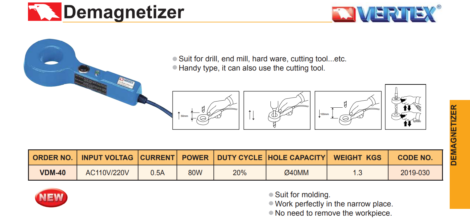 – Máy khử từ cầm tay VDM-50 của VERTEX dùng khử nhiễm từ cho các phôi lớn và nặng. Thích hợp khử từ cho khuôn mẫu.