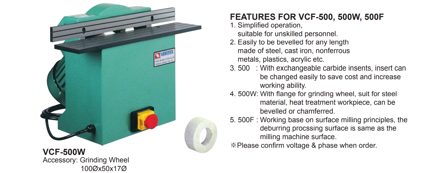 – Máy vát mép VCF-500W: Sử dụng đá mài để vát mép. Thích hợp cho vật liệu thép, phôi đã nhiệt luyện. Có thể vát nghiêng hoặc vát góc. Góc vát được 45°.