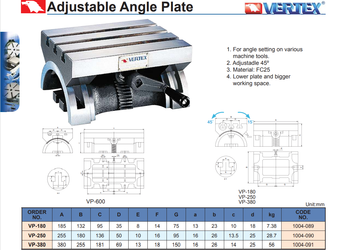 Bàn điều chỉnh góc nghiêng Vertex VP-180 dùng để gá kẹp và điều chỉnh chi tiết khi gia công chi tiết trên máy phay, và máy công cụ chuyên dùng…