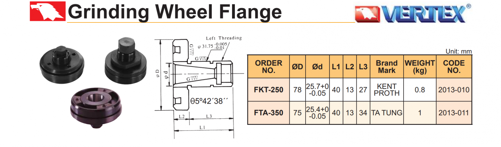 – Bích kẹp đá mài FKT-250, FTA-350 của VERTEX được chế tạo theo tiêu chuẩn KENT PROTH và TA TUNG.