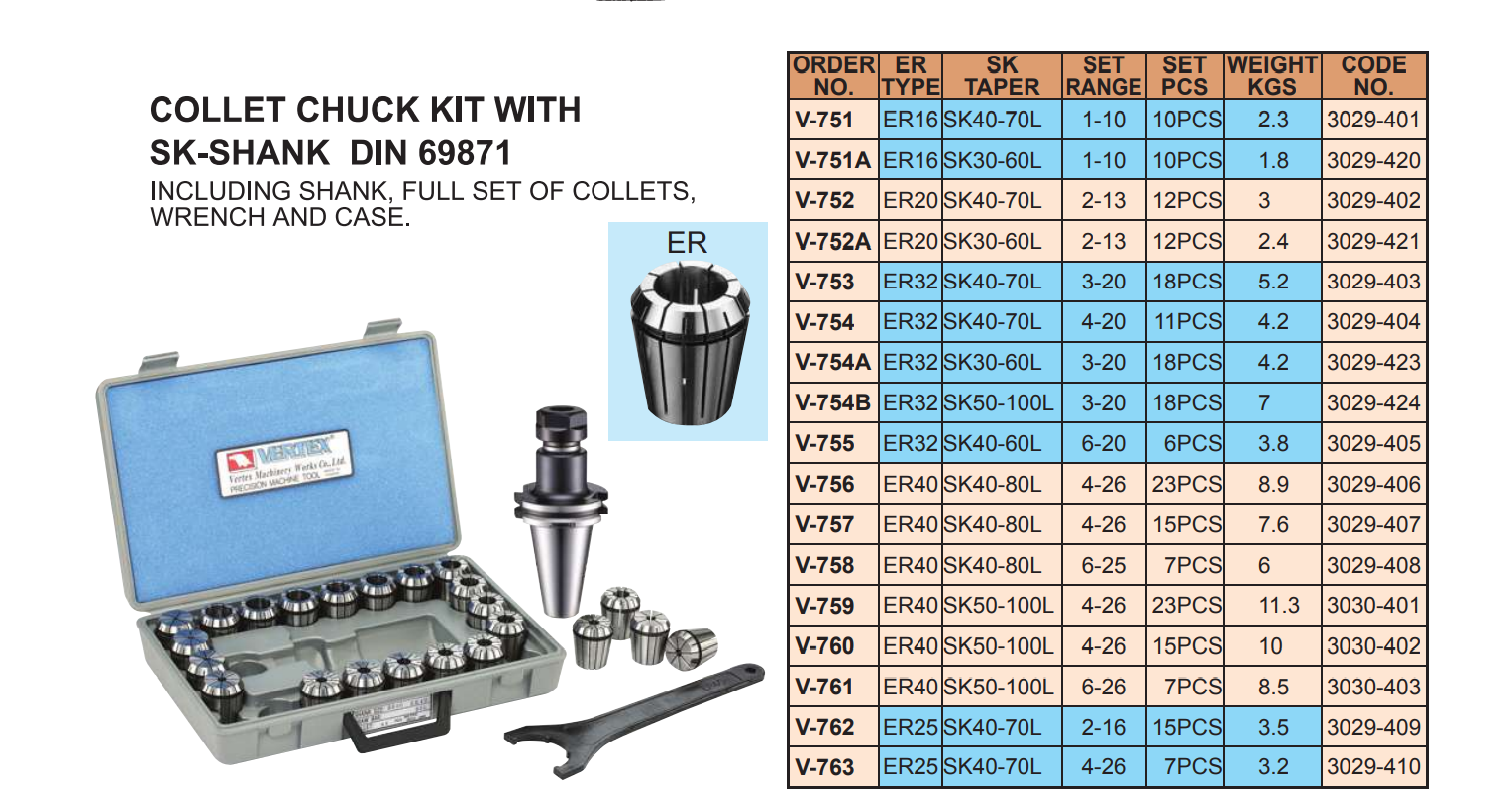 – Collet ER16, ER20, ER25, ER32, ER40 theo tiêu chuẩn DIN 6499 (xem sản phẩm Collet ER).