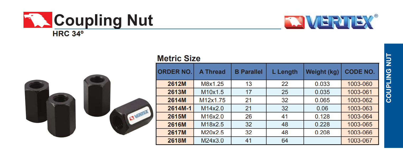 Đai ốc ghép VERTEX 2612M, 2613M, 2614M, 2614M-1, 2615M, 2615M, 2616M, 2617M, 2618M, 2612I, 2613I, 2614I, 2615I, 2616I, 2617I, 2618I, hãng Vertex, sản phẩm chuyên dùng cho việc lắp gắp trên các loại bàn máy phay, máy mài, máy khoan, và một số máy gia công cơ khí khác.