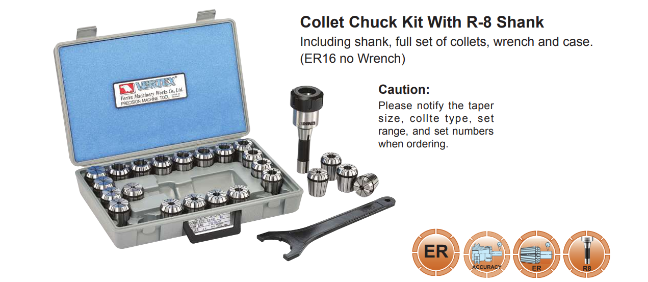 – Có thể đặt hàng theo bầu kẹp đơn lẻ (không có chìa vặn) hoặc cả bộ (bao gồm: bầu kẹp, bộ collet, chìa vặn (ER16 không có chìa vặn) và hộp; xem các model cả bộ ở bảng dưới