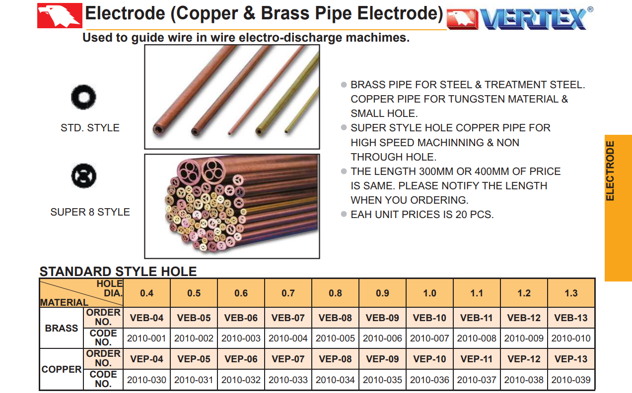 ĐIỆN CỰC ĐỒNG THAU CHO MÁY XUNG VERTEX VEP-04 , VEP-05 , VEP-06 , VEP-07 , VEP-08