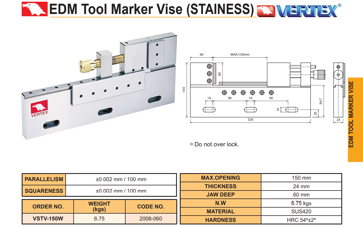 Ê tô máy EDM Vertex VSTV-150W với vật liệu là thép không gỉ, dùng để gá kẹp các chi tiết trong quá trình xung, cắt dây….