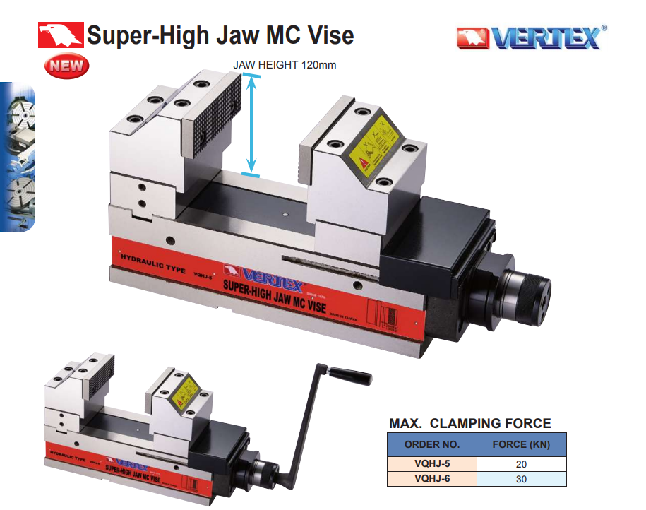 – Ê tô thủy lực má kẹp cao VQHJ của Vertex có chiều cao má kẹp rất lớn. Do đó, kẹp được các chi tiết lớn và chắc chắc hơn.
