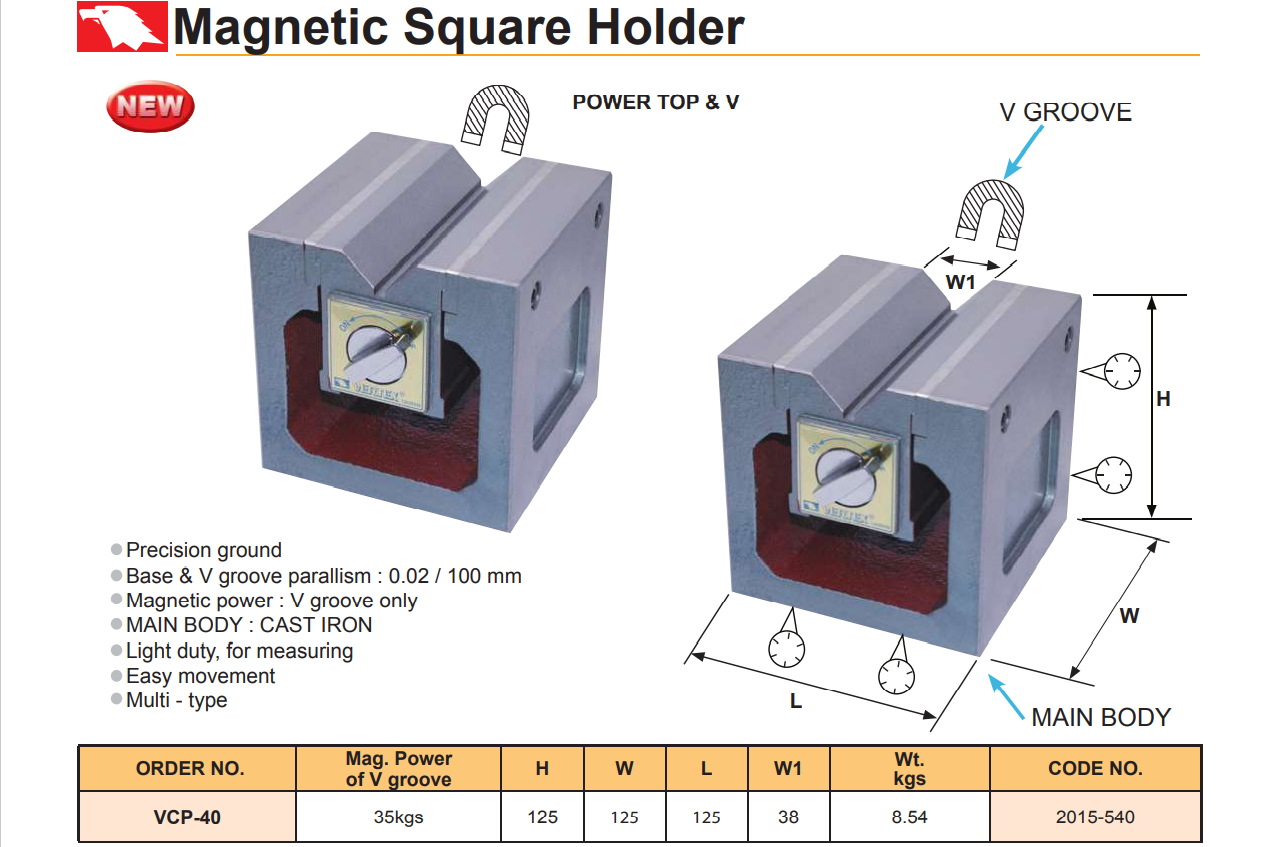 – Khối vuông nam châm VCP-40 của VERTEX được sử dụng để kẹp chi tiết kim loại định vị theo cả rãnh chữ V hoặc kẹp định vị mặt phẳng song song bằng mặt trên.