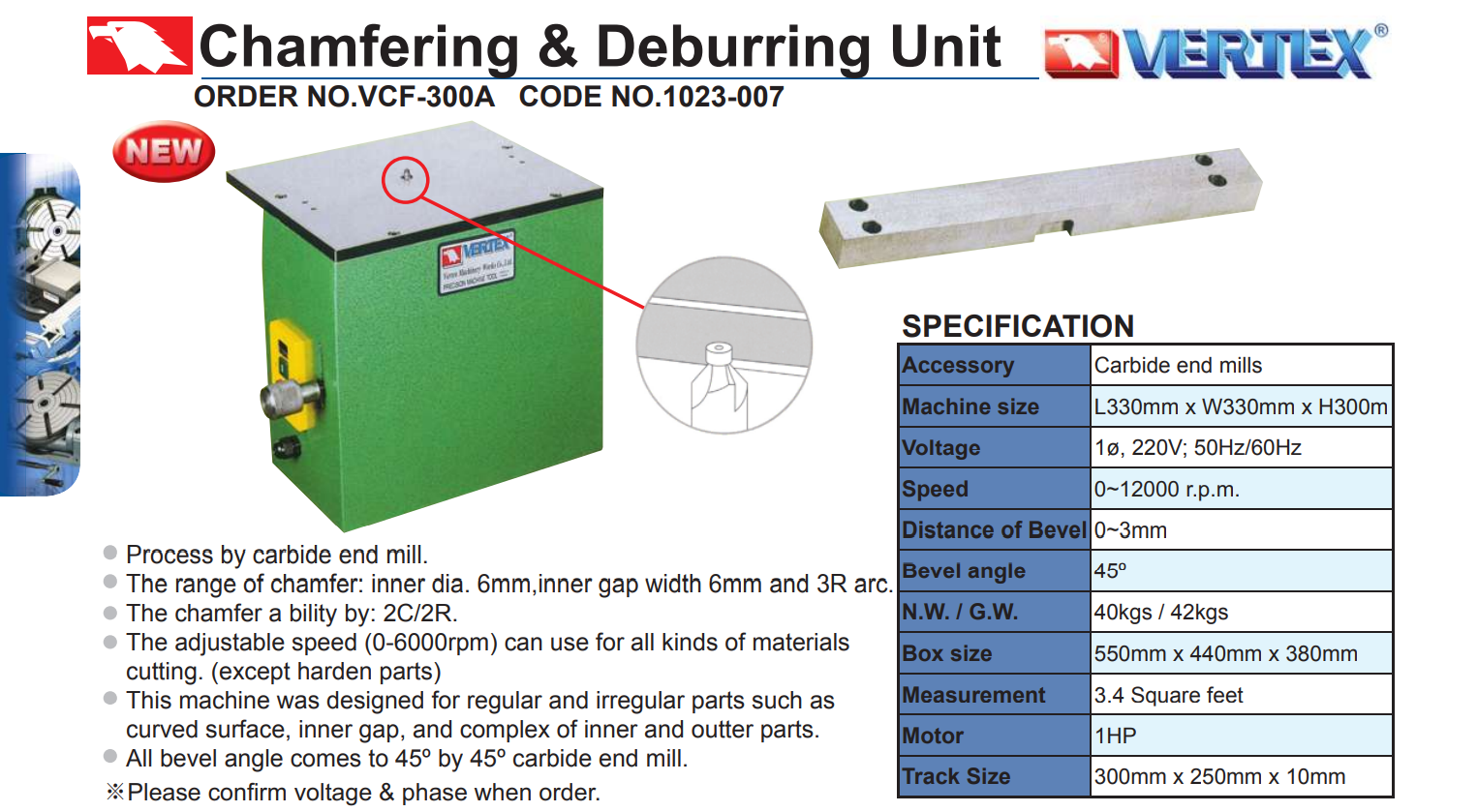 Máy vát mép và mài ba via VCF-300A dùng để vát mép những chi tiết dạng thẳng, cung tròn, lỗ...