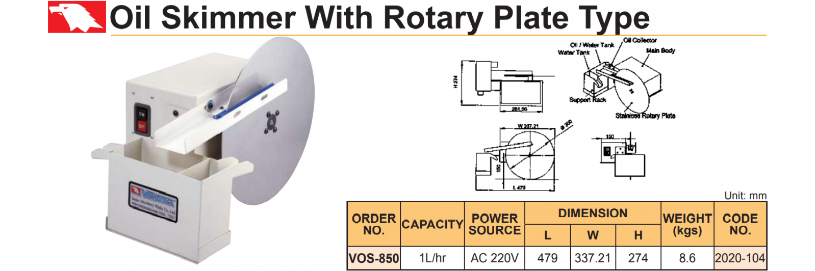 – Thiết bị thu dầu kiểu đĩa quay VOS-850 có đĩa quay bằng inox mỏng đường kính 300mm. Một phẫn đĩa quay được nhúng chìm xuống phần dung dịch có dầu nổi để dầu bám vào. Đĩa quay kéo dầu bám lên và được vắt tại 1 khe hẹp, và dầu được dẫn vào khe chứa riêng.
