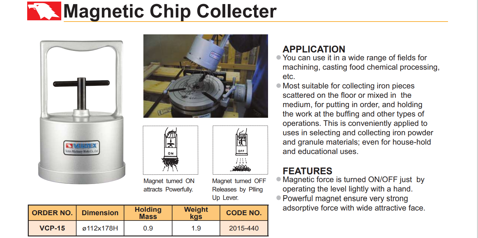 – Thiết bị thu phoi bằng lực từ VCP-15 có lực hút từ mạnh đảm bảo lực hút khỏe bề mặt phoi bám rộng.