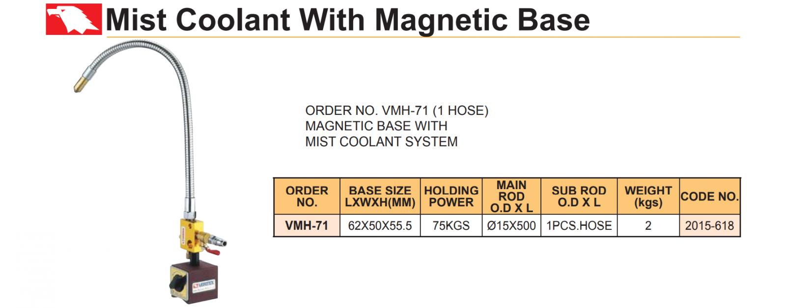 – Vòi tưới nguội dạng phun sương VCS-500, VMH-71 thích hợp sử dụng cho máy tiện, máy phay, máy khoan, máy ta rô, máy mài, mài cắt, máy NC, máy CNC, máy dậy, máy cưa,…
